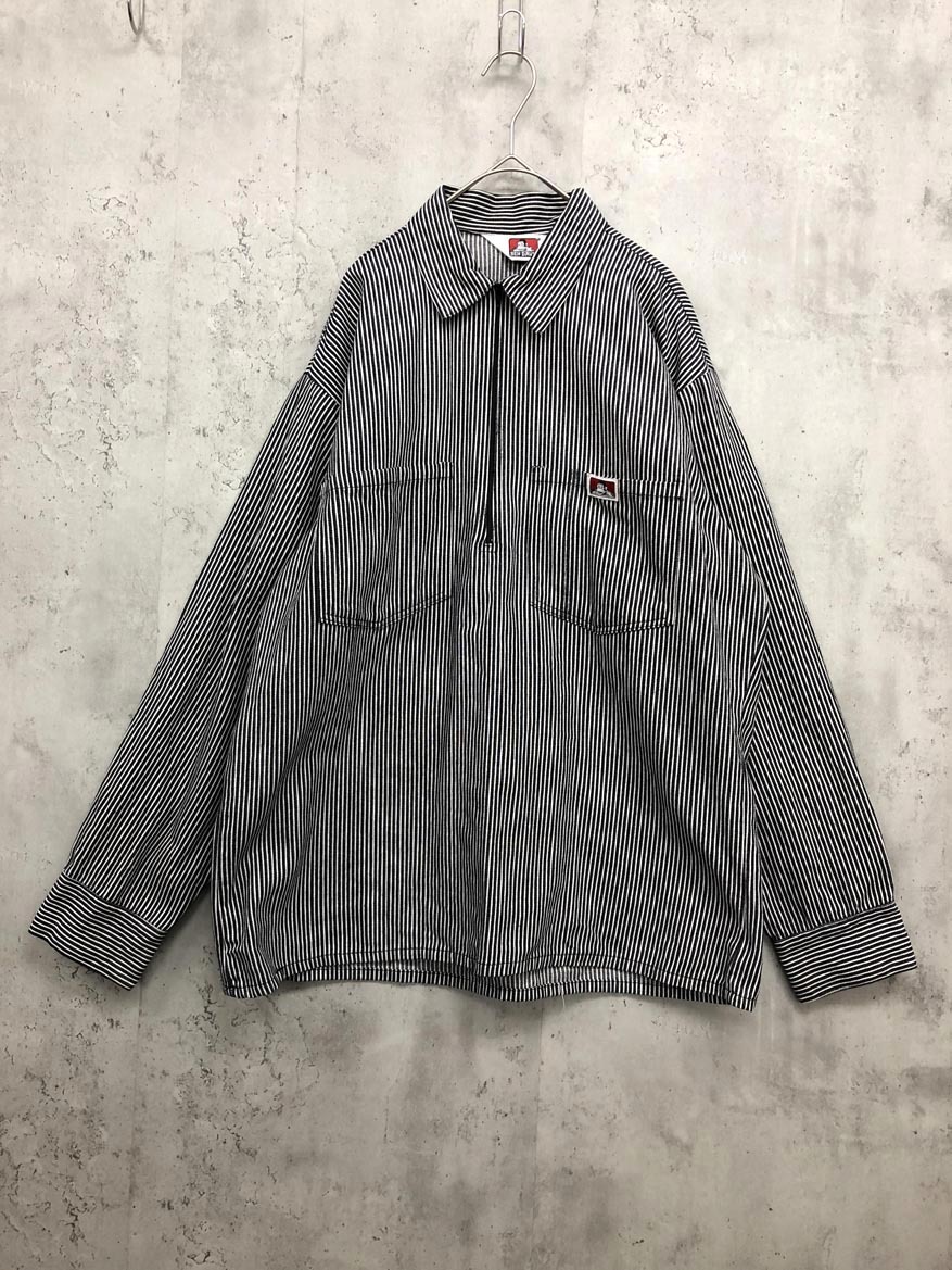 > BEN DAVIS ベンデイビス USA製 ハーフジップ ワークシャツ ストライプ プルオーバー sizeL/黒 ■■◎ ☆ fkb4 メンズ