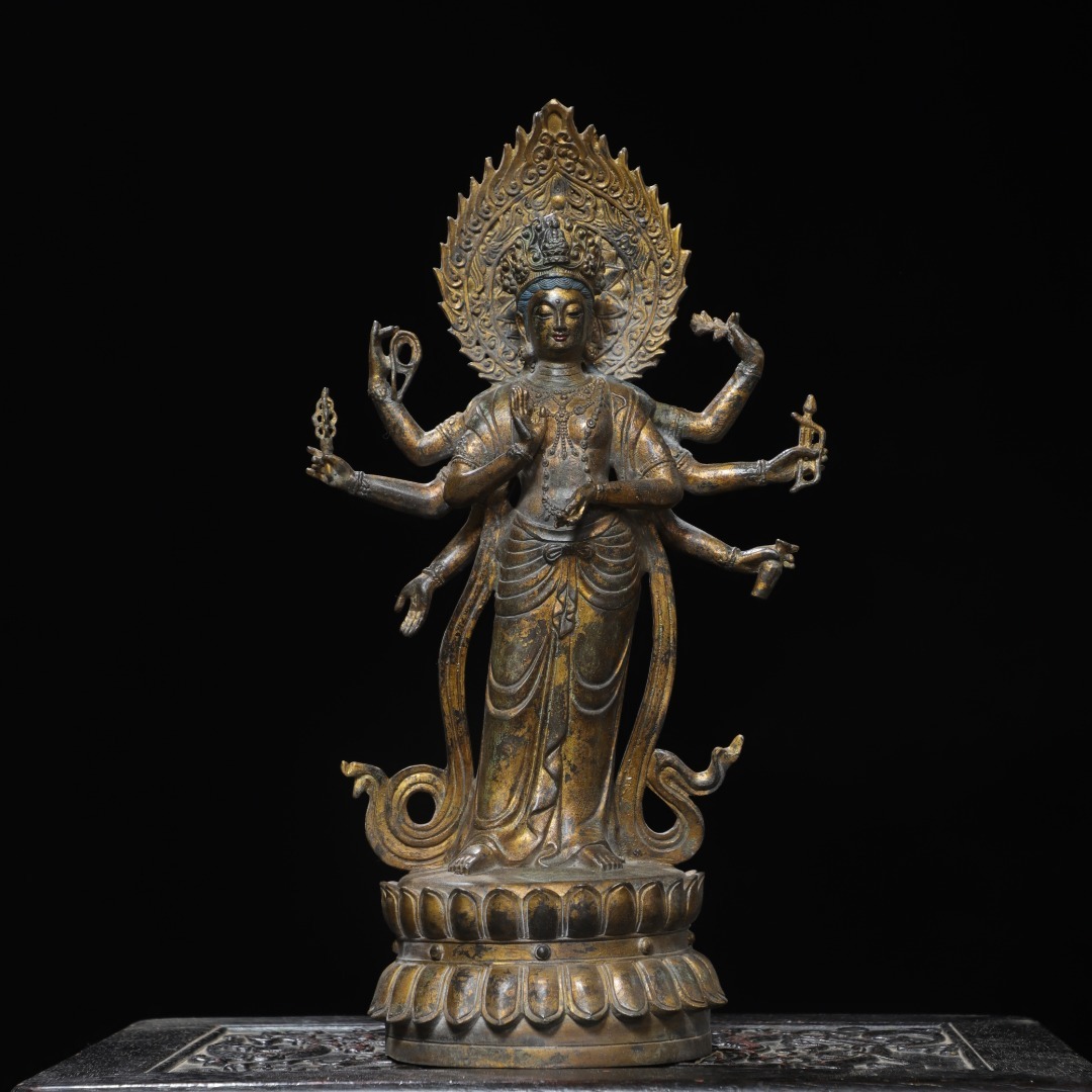 - 旧蔵 古銅彫 拓金 八臂觀音 古擺件 古置物 中国古玩 骨董品 時代物 稀少唐物