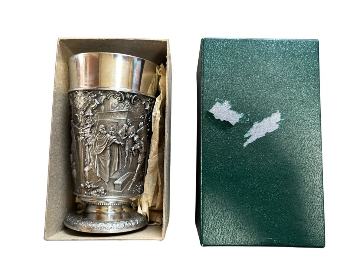 - 1円スタート: ピューター製 錫合金 ゴブレット アンティーク ドイツ製 タンブラー 酒器 ヴィンテージ品 浮き彫り 未使用に近い (w3059)