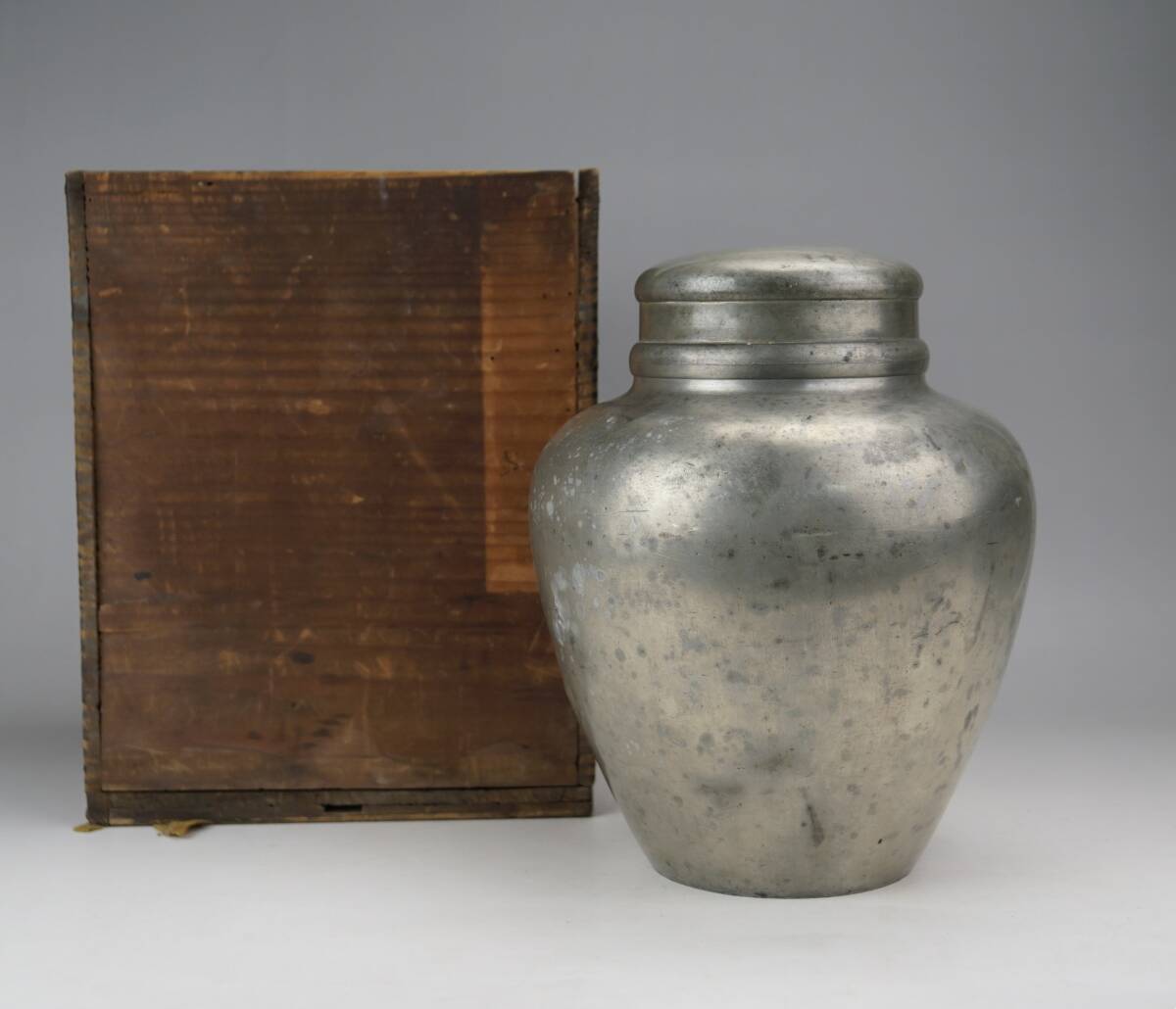 - 鳳】時代 古錫 御用御錫司 弥左衛門(弥左エ門)茶心壺(茶壺 茶壷 茶入) 高23cm 重2289g 木箱付検 煎茶道具 茶道具 古玩 古美術 骨董