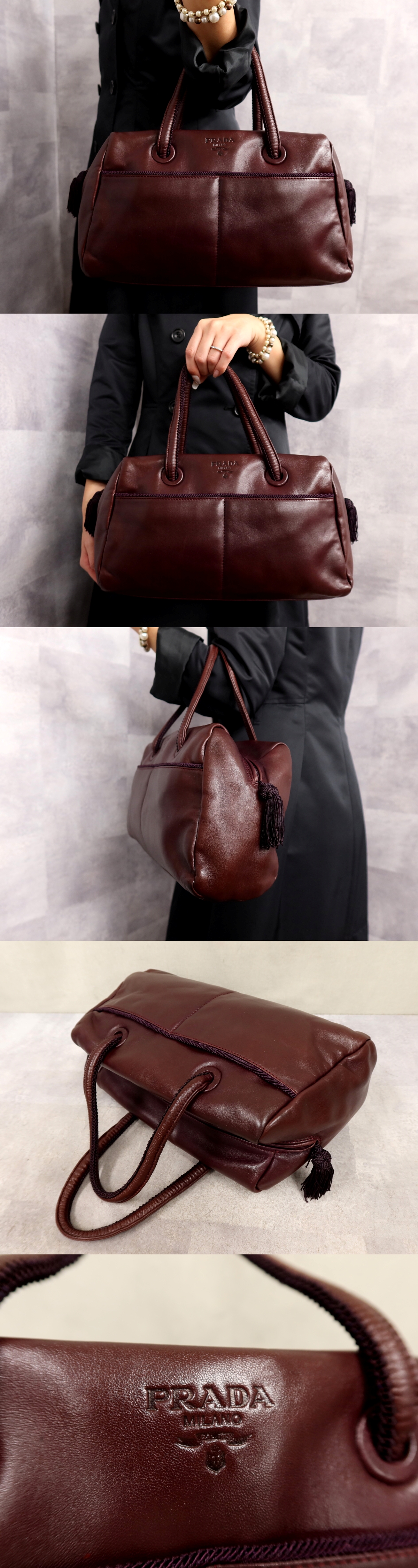 > ●超美品●PRADA プラダ●ロゴ型押し●タッセル●ラム レザー 本革●ハンド バッグ●ボルドー●イタリア製●腕掛け●かばん●Js62875