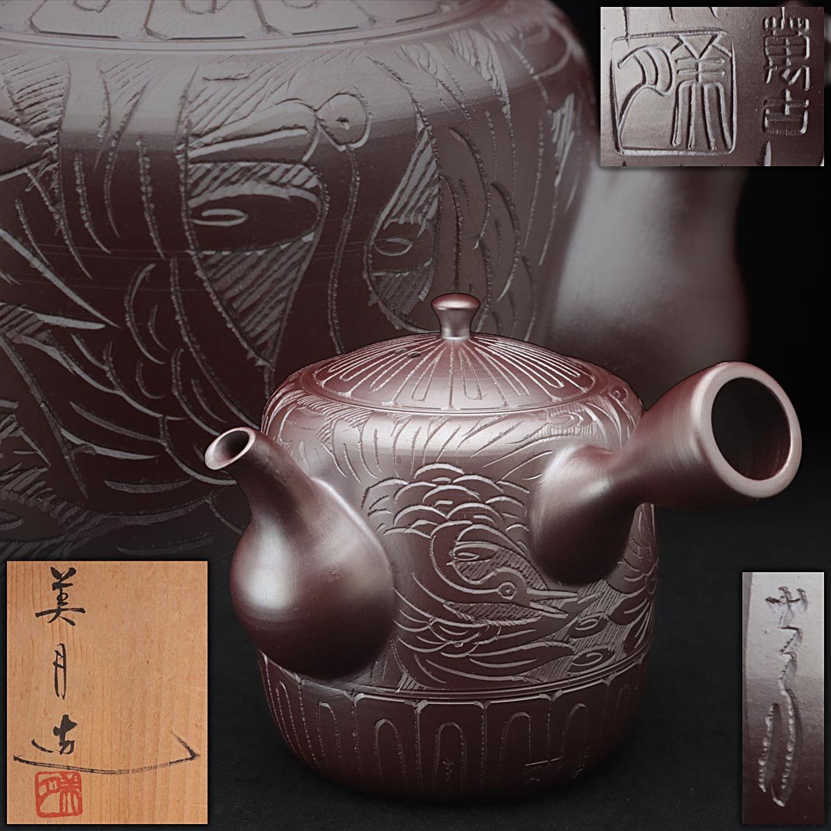 > JQ192 【伊藤美月 造】美月窯 萬古 鶴彫文 横手 急須 横長12cm 共箱附・萬古茶注・万古急須 茶器 煎茶道具