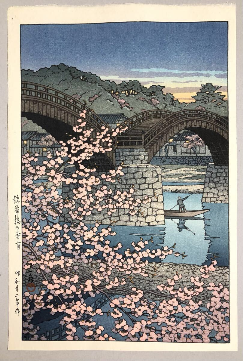 - 川瀬巴水『錦帯橋乃春宵』 木版画 新版画 ワタナベ6ミリ丸印 生存中摺 渡邊木版画舗 真作保証 hasui kawase