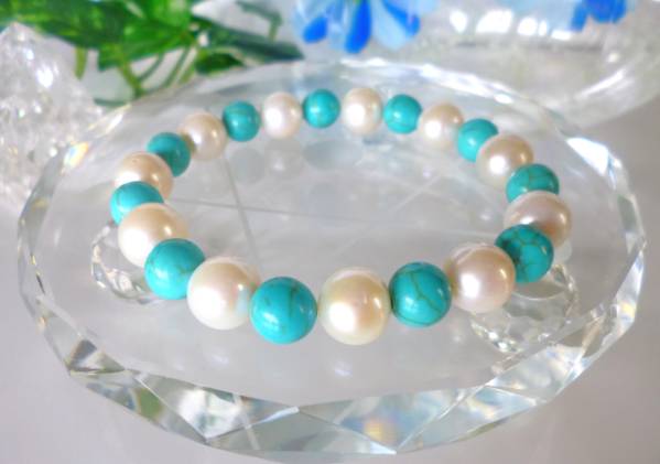 - ★ポジティブ思考★疲労回復★ターコイズ(マグネサイト)★美と若返リ★淡水パール♪ ☆16cm☆