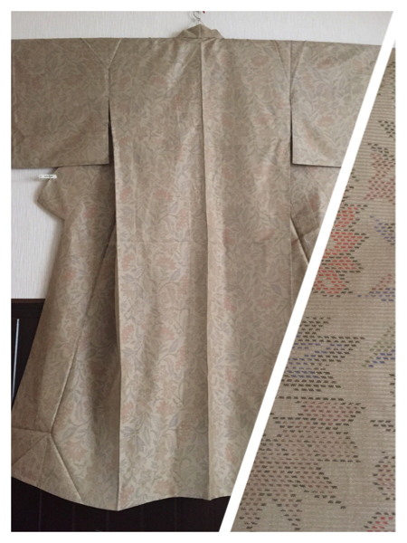 - 【単衣の着物】紬 身丈146.2cm 亜麻色 花柄