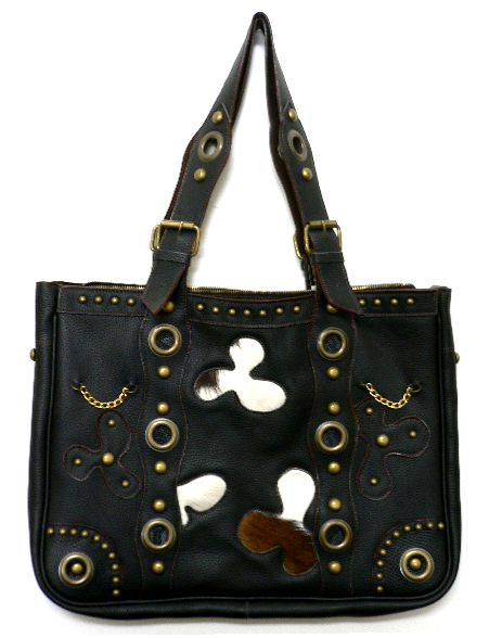 - 牛革×本ハラコmix パンク風スタッズ トートバッグ黒 1点のみ/レザーバッグALL20%OFF