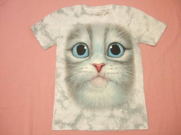 - 横浜最新 夜光可愛いドアップの猫ちゃん♪薄グレー絞り柄Tシャツ M, L 送料無料 ξtsξanξ60s