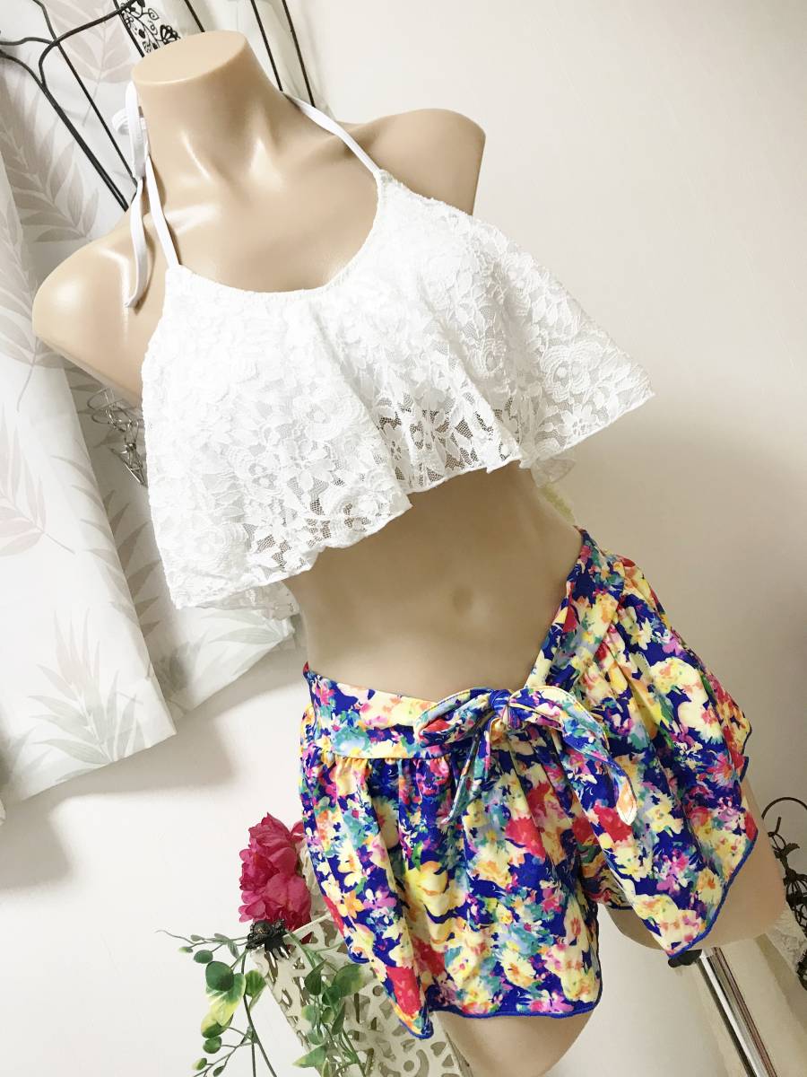 - ●水着 L●ひらひらレースフレアービキニ/ワイヤービキニ*キュロットパンツ 3点水着
