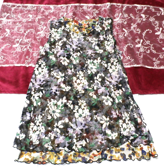 > ノースリーブ黒花柄2段フリル/チュニック/ワンピース Sleeveless black floral pattern 2 ruffle/tunic/onepiece