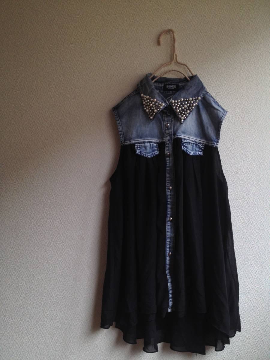 - ★SHAKE SHAKE シェイクシェイク★パールビーズ付きの襟が可愛いシフォン×デニムのブラウスチュニック★M相当★