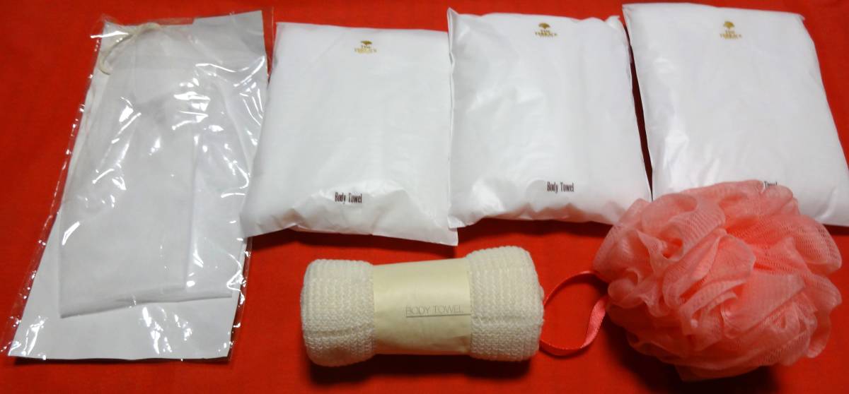 - 未使用!ボディーウオッシュタオル6点・ホテルアメニティー・ORBIS・ボディーショップ