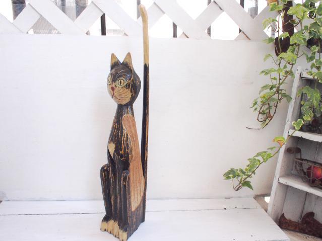 - ビンテージバリ島面白木彫り*尻尾がピ~ン三角猫ちゃん☆置物インテリア飾りディスプレイ