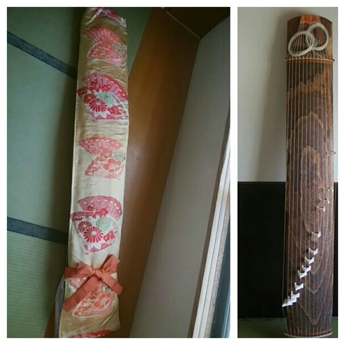 - [箏のカバー、油単]化繊/扇面/梅と菊/長さ2m29cm/幅33.5cm