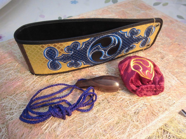 > ★**(送料無料) 4.990円 沖縄三線専用金襴胴巻き、縞黒檀爪、Topカバーセット