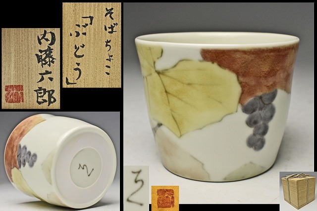 - 内藤六郎 ★ 色絵「ぶどう」そばちょこ ★ 共箱共布 ★ 酒器盃にも ★ 蕎麦猪口 ★ 陶水彩 ★