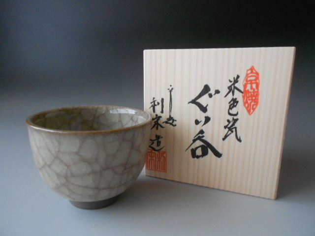 - 酒盃! 古川剛 米色磁ぐい呑 木箱 新品 京焼 サカズキ 酒杯 ギフト
