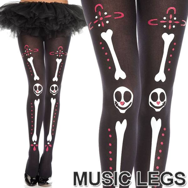 - A647)MusicLegsボーン&スマイルスカルプリントパンティストッキング ML37329 骨 ガイコツ ハロウィン 黒 ブラック タイツ パンスト