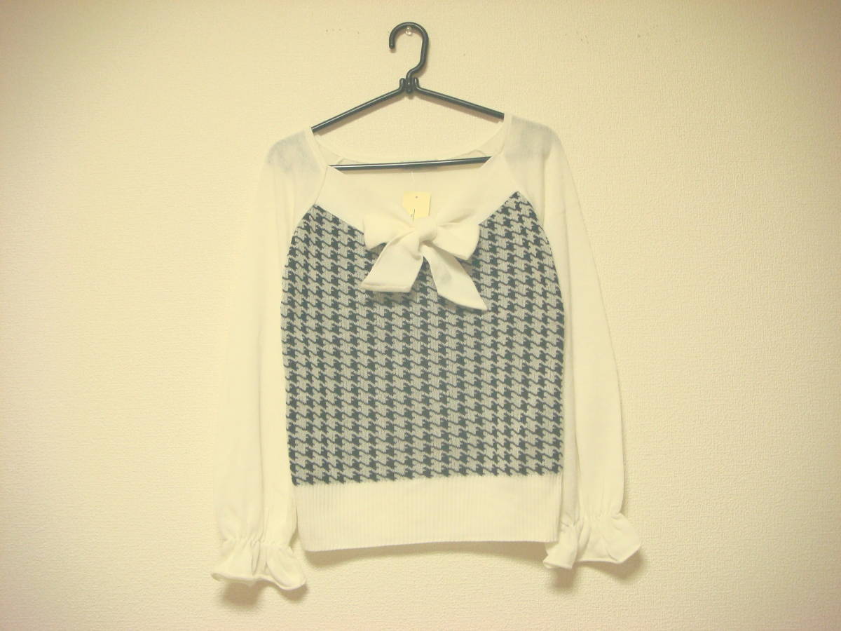 - 千鳥格子柄 リボン付き 切替えニットソー ニット タグ付き未使用 オフホワイト 新品 ガーリー