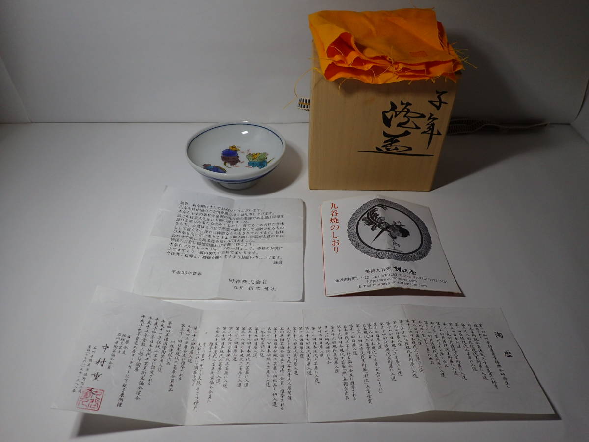 - 【未使用】久谷焼 中村重人 泡盃 猪口 共箱 栞 陶歴書 黄布 子年 鼠 干支 酒器