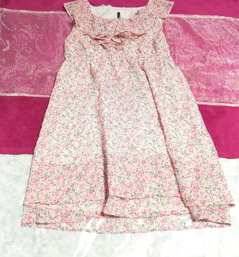> ピンク花柄フリルシフォンネグリジェノースリーブチュニックワンピース Pink floral frill chiffon negligee sleeveless tunic dress