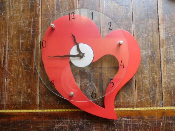 - 赤いハート型 掛時計060302 ガラス31cm 動作確認済み