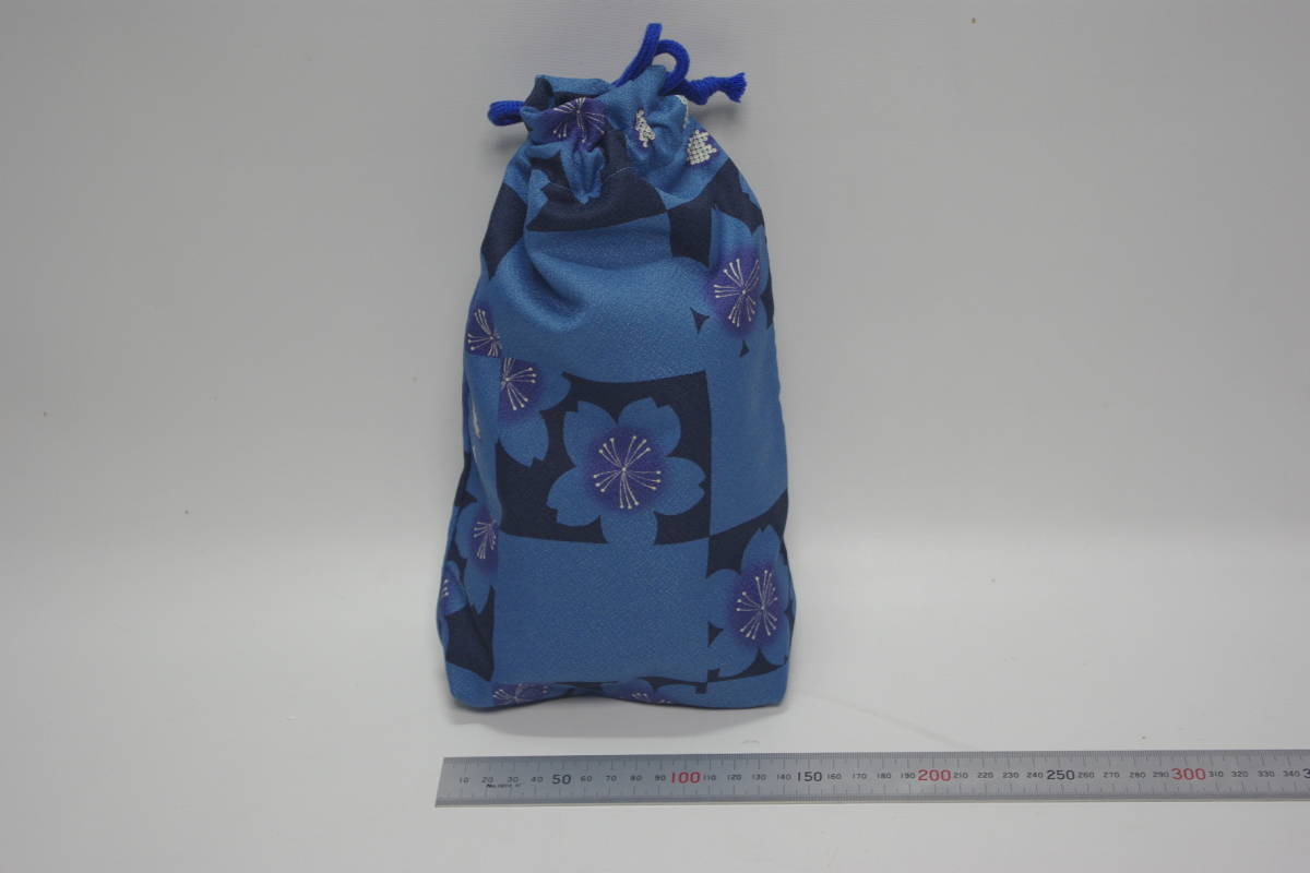 - 温泉巾着ポーチ・青色梅柄・ハンドメイド手作り品 未使用「おかあさんのお針箱」00100004