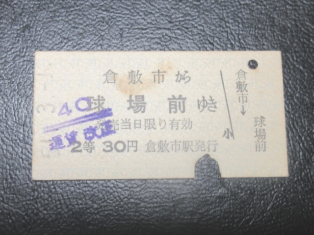- ★国鉄乗車券・硬券『昭和51年3月1日・倉敷市から球場前ゆき「紫40//運賃改正印」乗車券』キップ切符・レトロ・コレクション★JNR1007