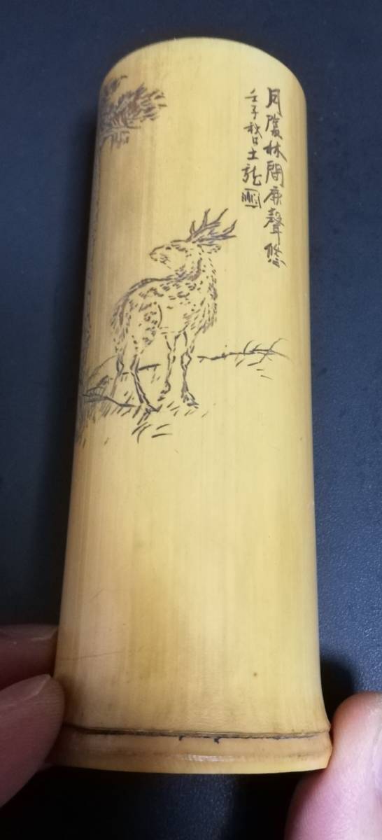> 根本勲(号:土龍) 香筒 唐詩 鹿 松 彫 一陽会彫刻部会員 在銘 本物保証 煎茶道具 古美術品 香道具 利休 裏千家 表千家