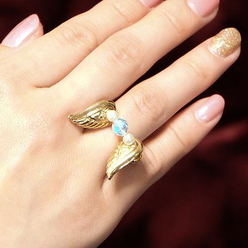 - ★人気★可愛い★風水★恋愛★愛と美の女神★開運の万能石★真鍮製ゴールド天使の羽パワーストーンリング★水晶&樹脂パール&ルナフラッシュ