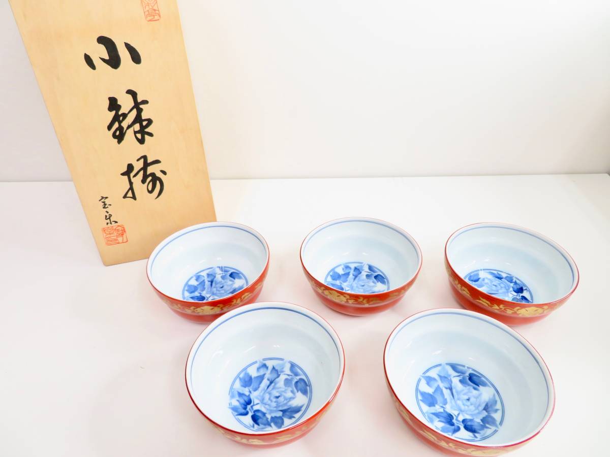 - ◆京紫龍峰 宝朱 小鉢 5客セット 食器 和食器 朱色 器 伝統 工芸品 磁器 陶芸 未使用品 管理2010 W-2