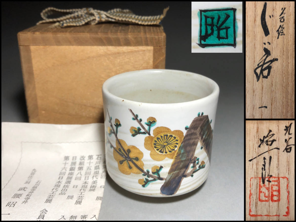 - A28 九谷焼 ぐい呑 酒器 九谷庄三洞 武腰昭一郎 練込 色絵金彩梅図 栞・共箱 盃 猪口 酒盃