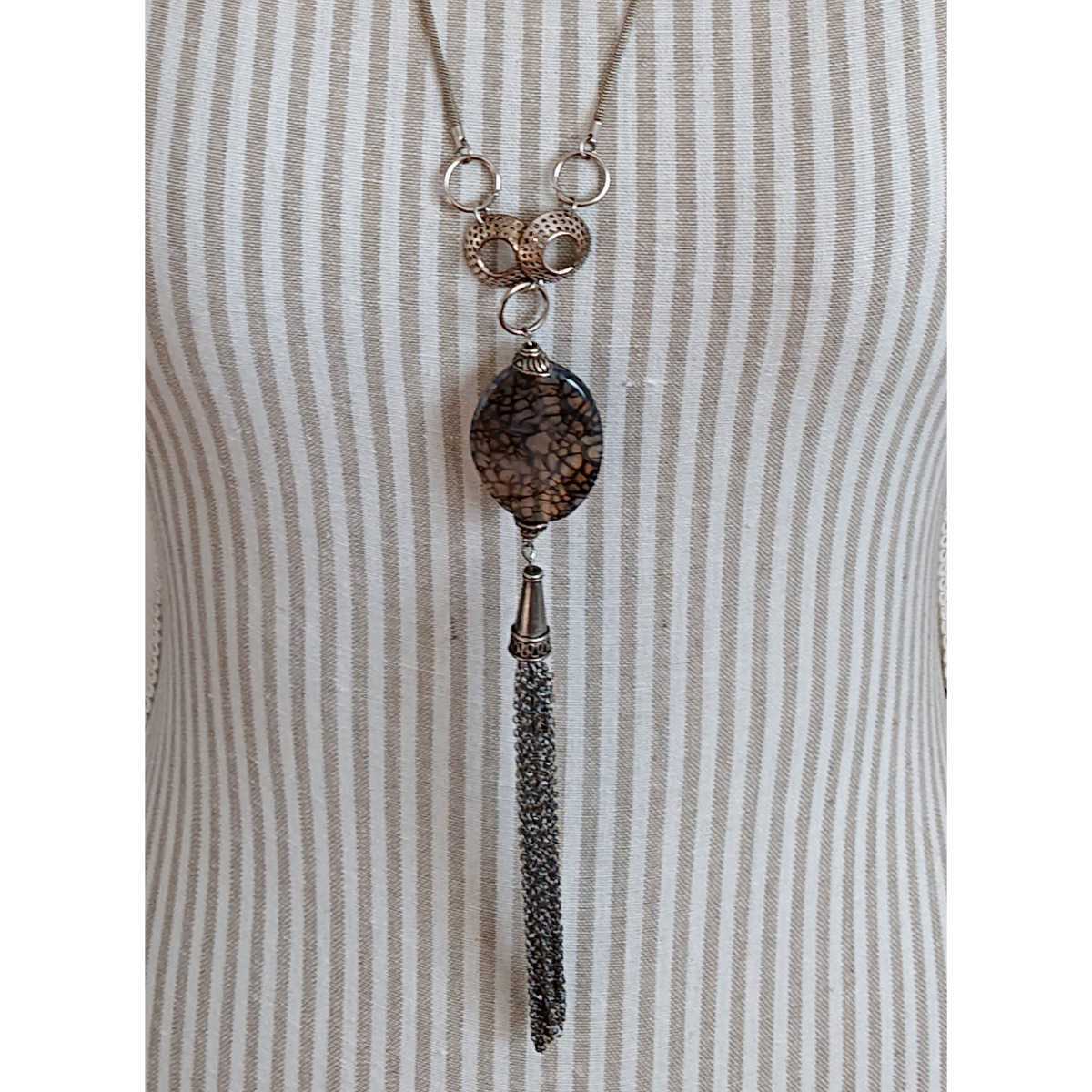 - □訳あり□オリエンタル感□割れ模様入りストーン&チェーンフリンジのロングネックレス□