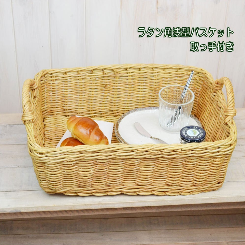 - ラタン角 浅型 取っ手付き かご 収納用バスケット ストック