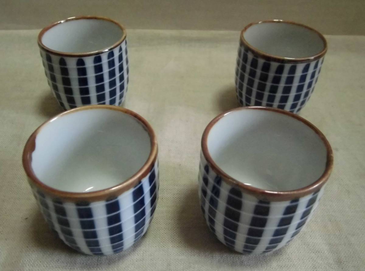 > ぐい呑み 染付 縦縞柄 お猪口 4客 盃 杯 酒器 工芸品 陶器 レトロ アンティーク