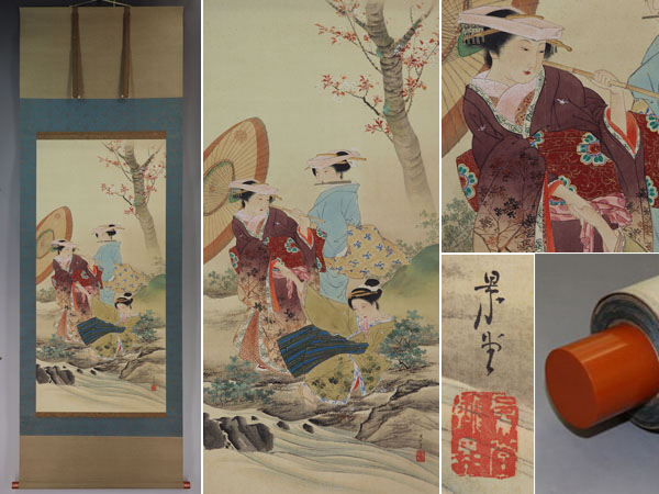 - 名品【真作】富樫景堂【佳人逍遥】◆絹本◆共箱◆掛軸 v03090