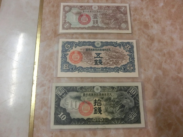 - ★ 日華事変軍票 丁号1銭・丁号5銭・丁号10銭 極美品 3種3枚セット ★ No.330