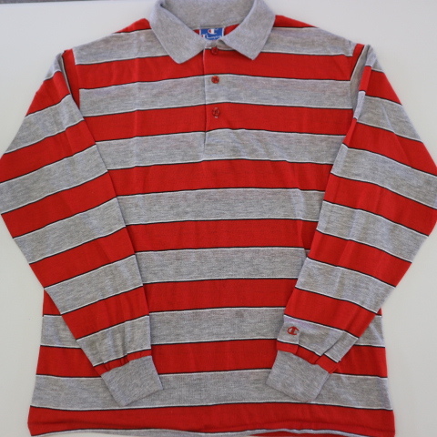 - 80s USA製 Champion 長袖 ポロシャツ XL ボーダー レッド グレー 青刺繍タグ ラグビー ラガーシャツ チャンピオン ヴィンテージ