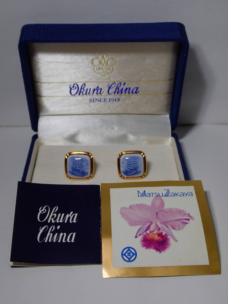 - 大倉陶園 Okura China カフス 帆船 箱、栞あり カフスボタン ホワイト×ライトブルー×ゴールド