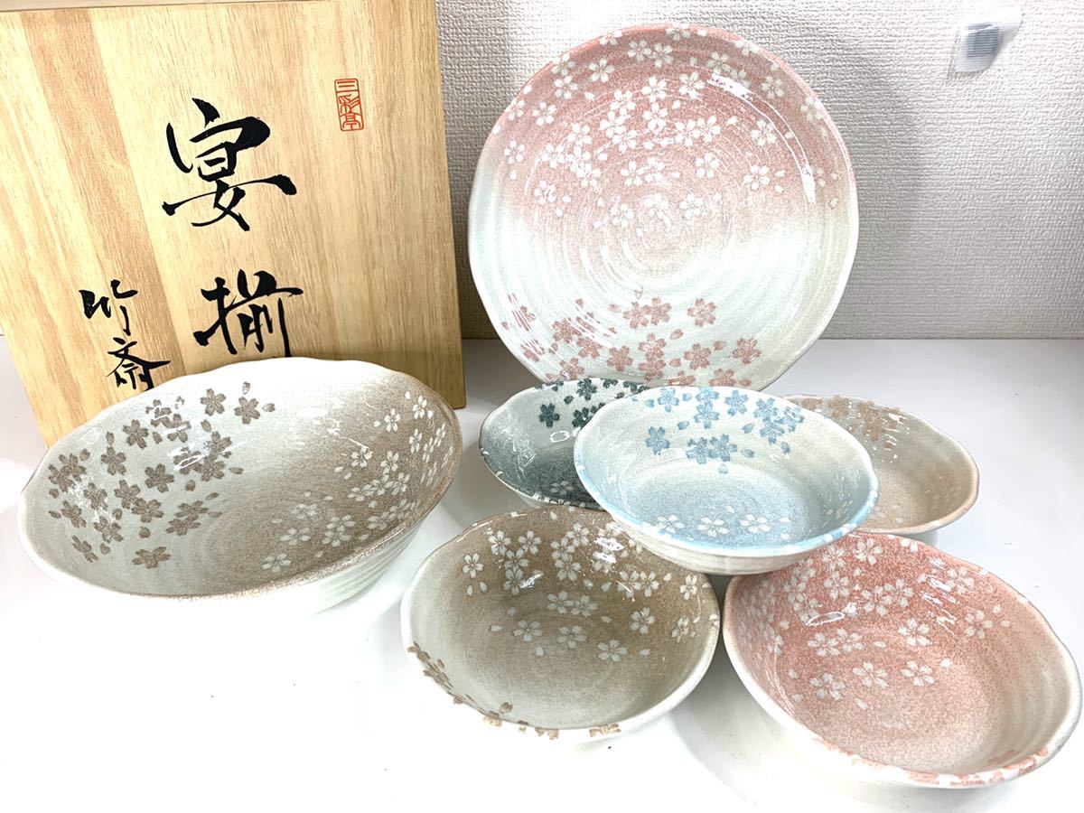 - 未使用品▲三洋陶器 竹斎 花みずき 宴揃 85773 大皿1枚 大鉢1客 小皿5客 木箱入 管理2109 M-13