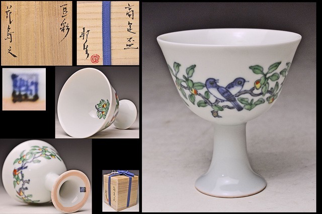 > 林邦佳 ★ 豆彩 花鳥文 高足 ぐい呑 ★ 共箱 ★ 繊細で美しい逸品 ★ 瀬戸市無形文化財 ★ 中国清朝写 ★ 酒器 ★