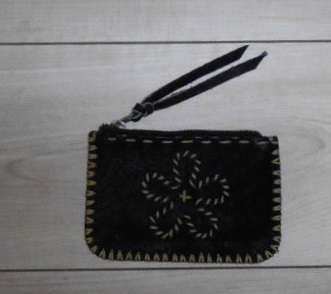 - レザー コインケース 革 ブラック ハーフ 財布 小物入れ 花刺繍 フリンジ D 黒 フラワーステッチ バンコクで購入 メンズレディース