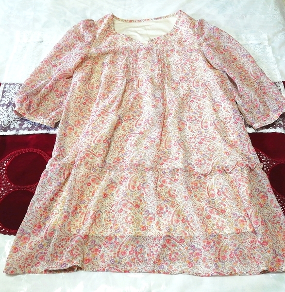 > 赤エスニック柄シフォン長袖チュニック ネグリジェ ワンピース Red ethnic pattern chiffon long sleeve tunic negligee dress