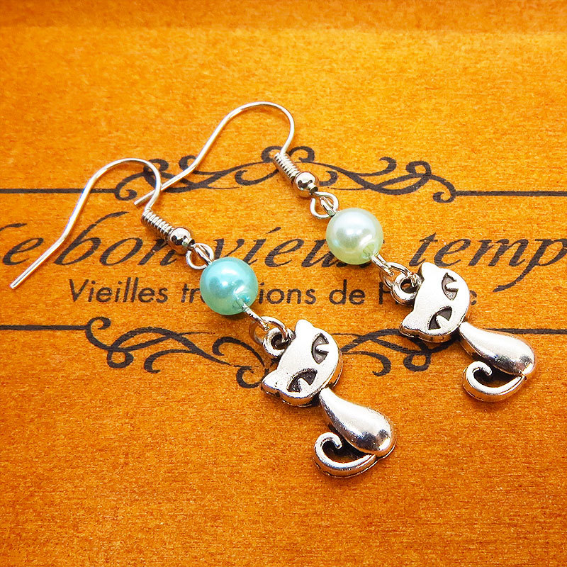 - アンティークシルバー 猫モチーフとカラービーズ(碧色)を組合せたシンプルで大人可愛いピアス サージカル可