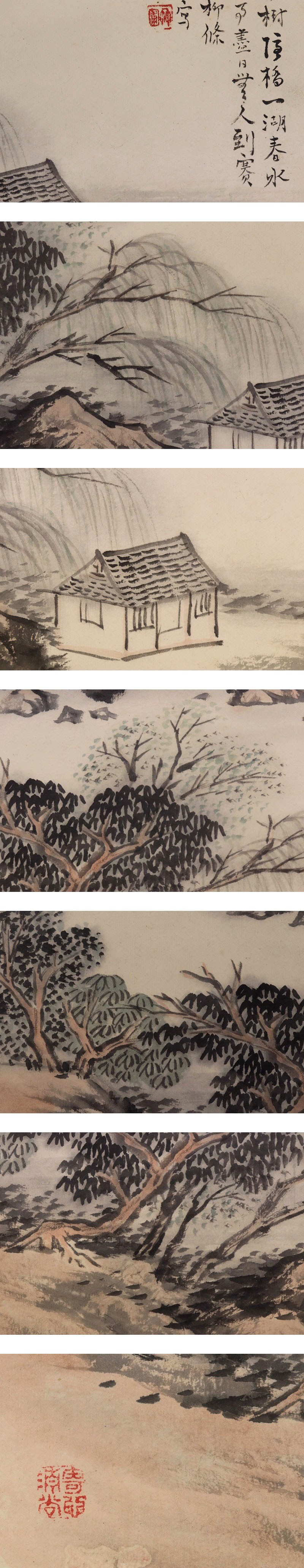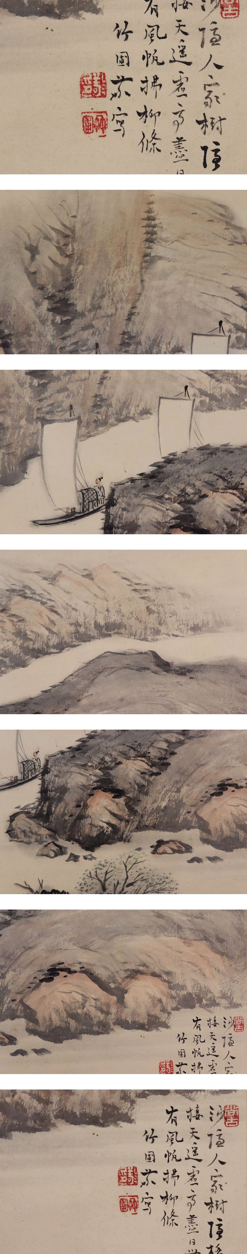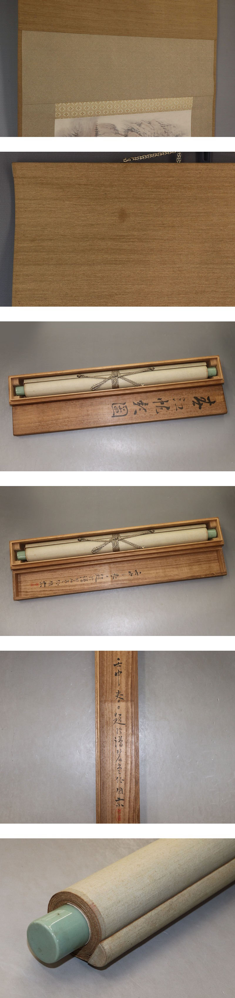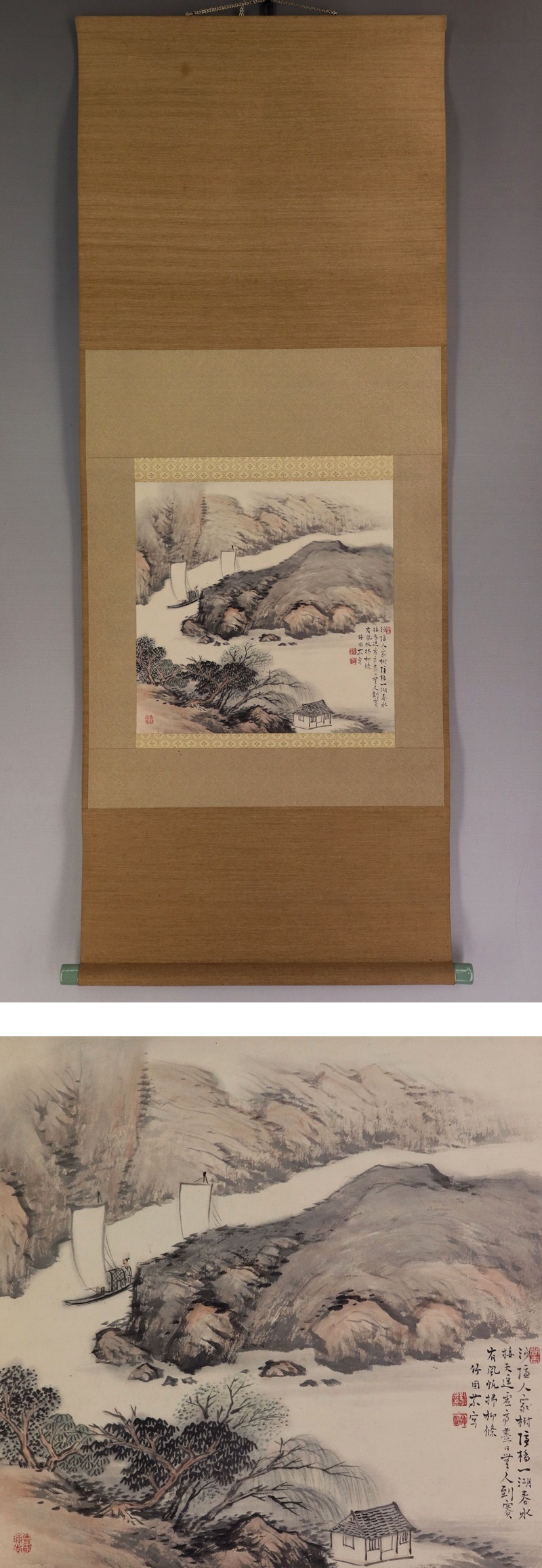 - 名品【真作】水田竹圃【春江帆行図】◆紙本◆共箱◆掛軸 v11156
