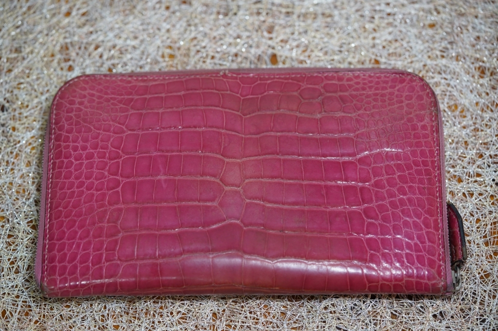 - 【最上級品】【cousu main】手縫い フランス製 センター取り クロコダイル 長財布 ヴィンテージオールド 本物 ピンク グリーン