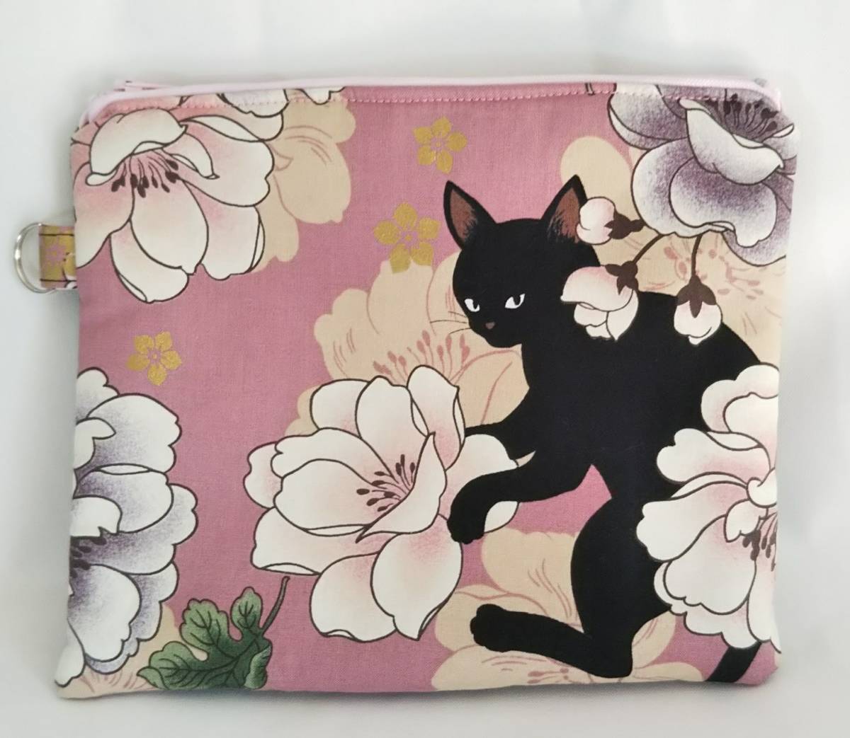 - 黒猫と牡丹■ポーチ(ローズピンク)【約よこ21cm×たて18cm】通帳入れ 御朱印帳 お薬手帳 百花繚乱 キルトゲイト 和柄 着物