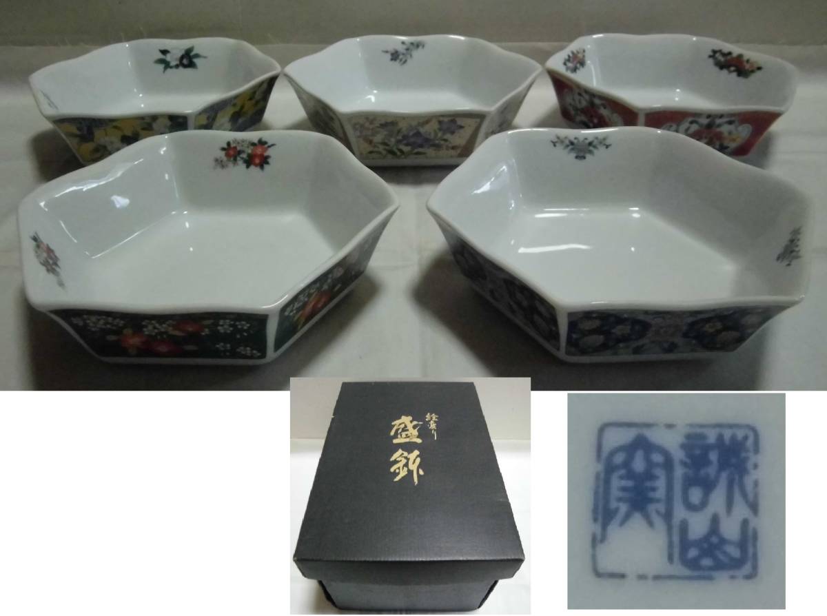 - 中鉢 六角 絵変り 盛鉢 謙山窯 5客 箱入り 色違い 柄違い 花柄 色絵 平鉢 工芸品 陶器 食器 レトロ