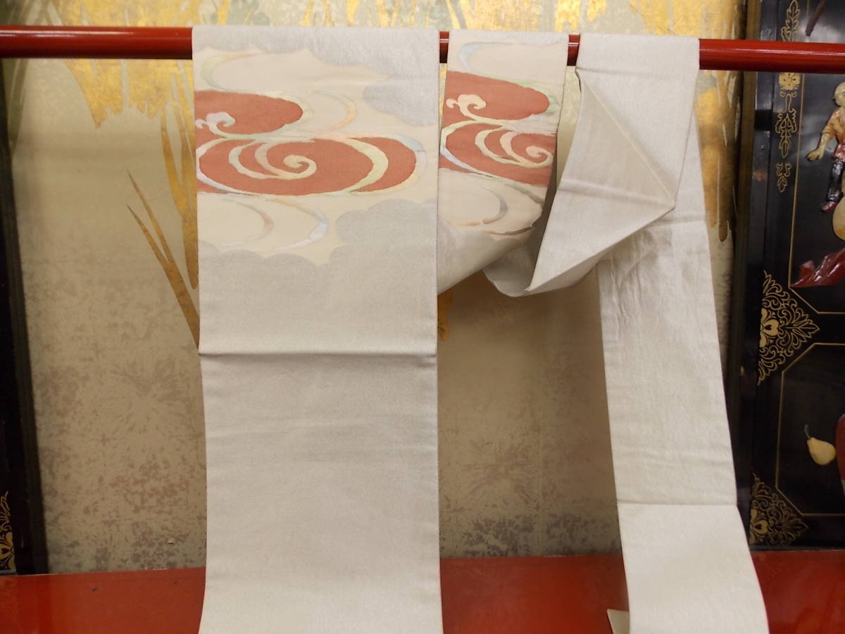 > きもの今昔3333 名古屋帯 西陣織正絹九寸名古屋 銀色地に太鼓と前腹に柄付け