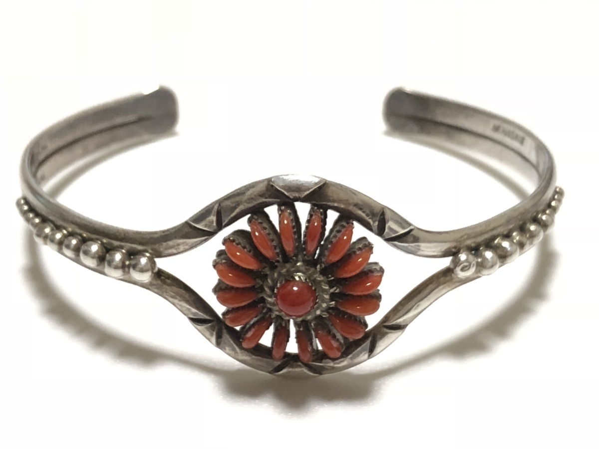 > インディアンジュエリー ズニ族 コーラル STERLING SILVER 13.0g 作家物 NF.HASKIE クラスター デザイン バングル
