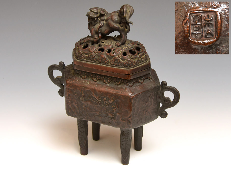 > 高岡銅器 須賀松園(造)獅子文 香炉 蝋型鋳銅 重:1.3kg 茶道具 香道具 時代 赤銅 唐銅 古銅 銅製 金属工芸 無形文化財 z2947n